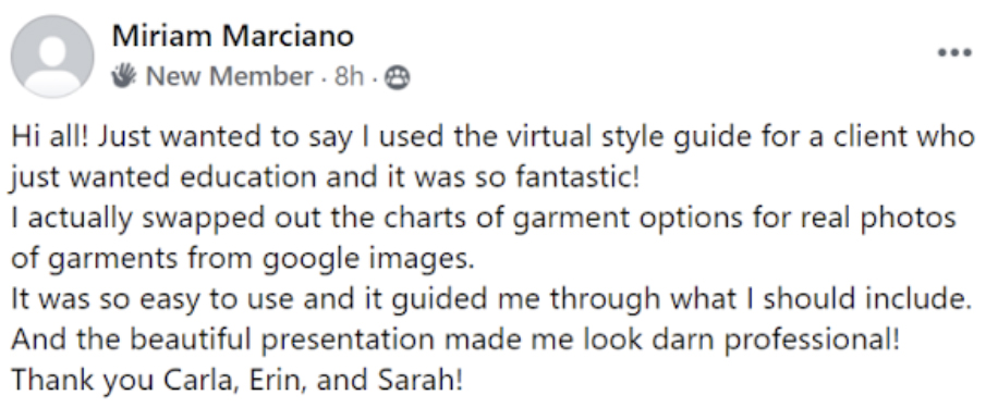 I LOVED this course! The templates were very very helpful. I also enjoyed the new virtual styling service options you gave. I have my first virtual client tomorrow!
